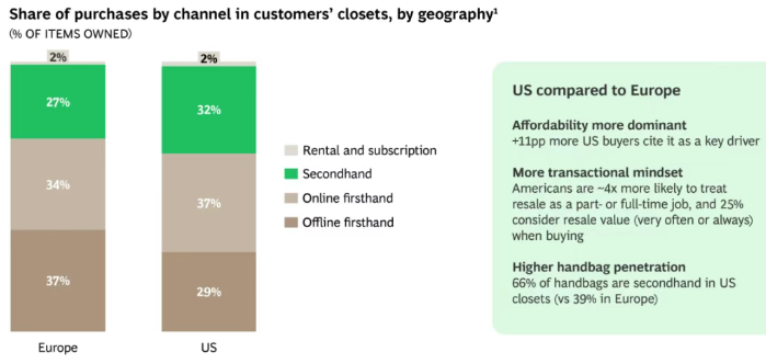 美国受访者在二手商品消费方面走在前列,二手商品占他们衣橱的32%,其中手袋的比例更是高达66%(欧洲为39%)。