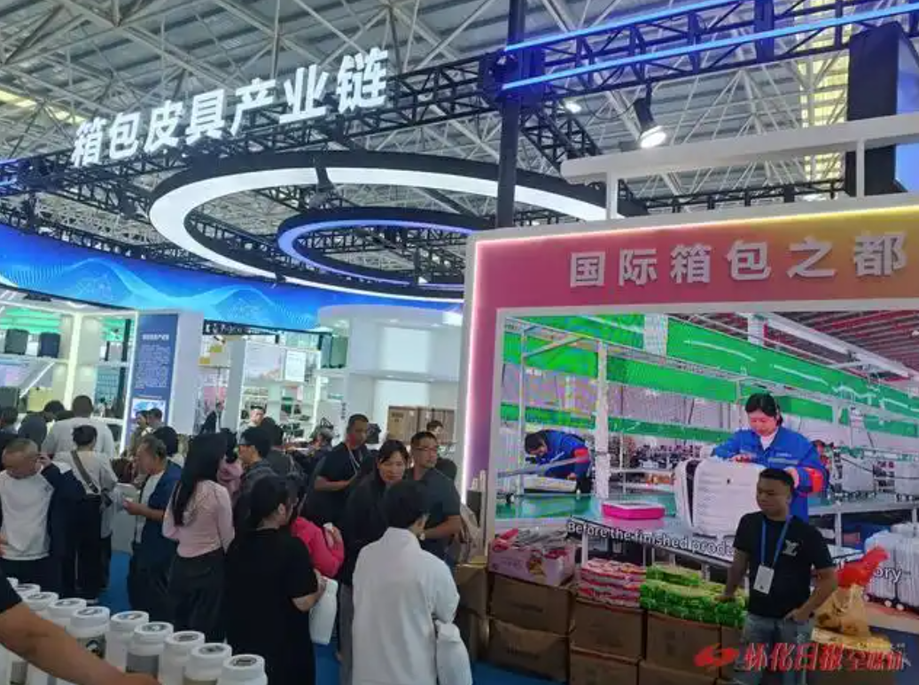 在2025年5月举行的第二届湖南(怀化)RCEP经贸博览会上,怀化箱包皮具产业链展馆前门庭若市。(怀化日报全媒体记者 谌孙存 通讯员 王馨悦 摄)