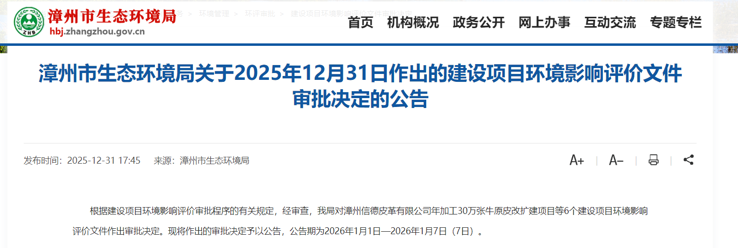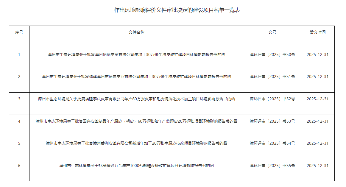 据漳州市生态环境局消息,根据建设项目环境影响评价审批程序的有关规定,经审查,漳州市生态环境局对漳州信德皮革有限公司年加工30万张牛原皮改扩建项目等6个建设项目环境影响评价文件作出审批决定。现将作出的审批决定予以公告,公告期为2026年1月1日—2026年1月7日(7日)。