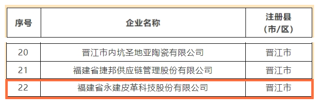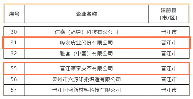 记者从名单获悉,峰安皮业股份有限公司、晋江源泰皮革有限公司入选市级上市后备企业名单,福建省永建皮革科技股份有限公司入选市级挂牌后备企业名单。