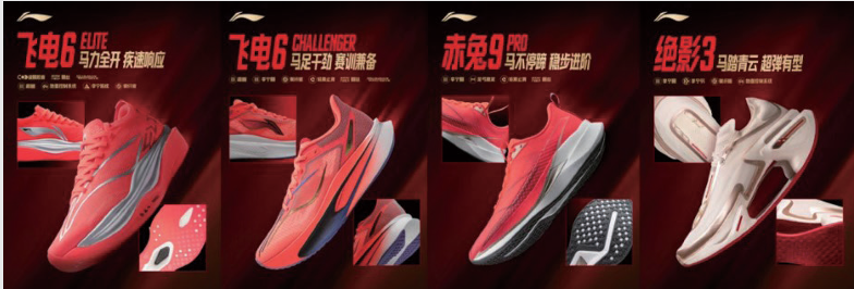 2026马年新春,李宁延续“以中国名驹喻跑 鞋”的核心逻辑,重磅推出“马上加马”新春限定 跑鞋系列,以飞电6 Elite、飞电6 Challenge、赤 兔9 PRO和绝影3共四双王牌跑鞋为载体,注入马 年专属设计语言,构建起覆盖全场景跑者需求的产 品矩阵,让疾速奔跑的马年精神与专业运动科技深 度交融。此次新春限定系列在此基础上升级,鞋面 融入马年专属配色——朱红撞金彰显新春喜庆,墨色暗纹勾勒骏马奔跃姿态,细节处暗藏“马上加鞭”、 “奔逸绝尘”的吉祥寓意。四双跑鞋分别适配精英竞 速、进阶训练、日常路跑等不同场景,延续各自标 志性的中底科技与轻量化设计,既保障专业运动性 能,又以文化赋能激发跑者情感认同。