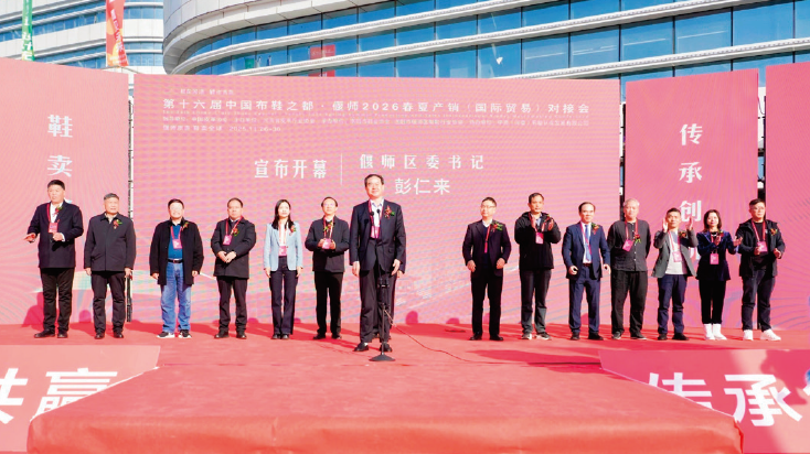 11月26—28日,第十六届中国布鞋之都·偃师2026春夏产销国际贸易对接会在洛阳偃师循环经济示范产业园举办。430家鞋业单位、36家鞋机鞋材展商携新产品、新技术亮相,搭建起高效对接平台,展现了“中国布鞋之都”的行业凝聚力。偃师区委书记彭仁来宣布开幕。