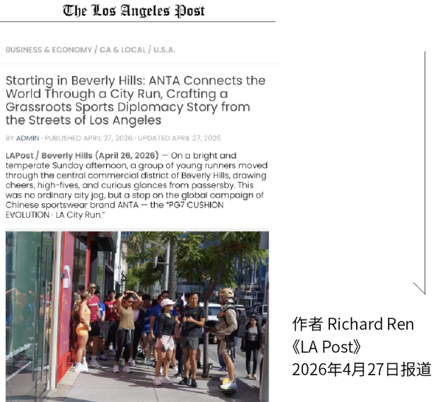 2026年4月27日,洛杉矶邮报(The Los Angeles Post)刊发文章,报道了安踏在美国比佛利山庄举办的城市跑活动。本次活动以安踏PG7旅步三代上市为契机,以安踏比佛利山庄门店为起点,并计划拓展至全美。该活动是“PG7缓震全球计划”的延续,自2025年起已覆盖上海、波士顿、纽约、迪拜、吉隆坡等十余座城市,成功实现了产品体验与城市文化的深度交融。报道全文如下: