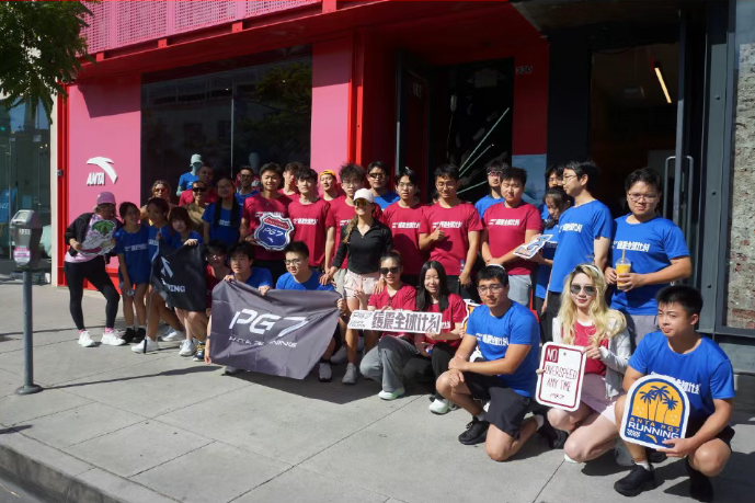 这场全程约5公里的城市跑,以安踏比弗利山庄门店为起点与终点,参与者主要来自加州大学洛杉矶分校(UCLA)与南加州大学(USC)的学生群体。身着蓝、红配色运动上衣的跑者被编入混合队伍,在城市街道间完成打卡自拍等互动挑战。不同文化背景、不同学校身份在奔跑中被有意打散与重组,使活动本身成为一次跨群体的社交实验。