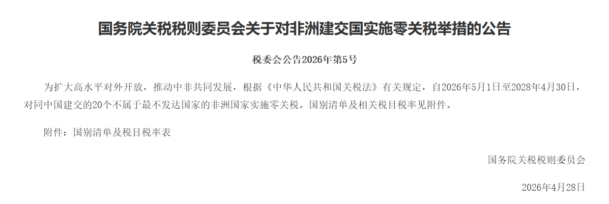 我国自2026年5月1日起对所有非洲建交国实施零关税