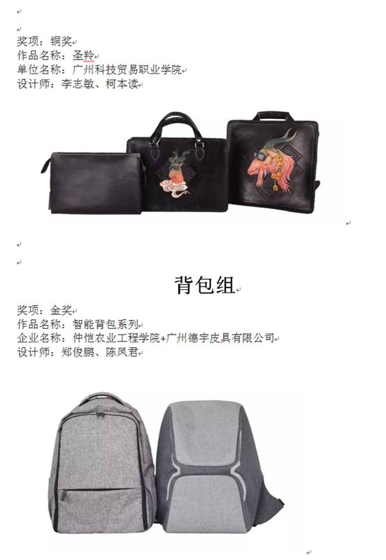 专业组则涌现出了一批做工精湛的匠心之作,女包金奖作品《城市印象》皮雕工艺精雕细琢堪称艺术品;更让人拍手称绝的是现代高新科技的完美融入,带LED灯的酷黑男包,能遥控行走的专利技术多功能电动旅行箱,护婴、按摩、定位、空气防水、防狼、摄像等多功能背包,将科技元素应用与人性化设计发挥到淋漓尽致。评委们表示,科技元素的应用是行业发展的新趋势,本次大赛得奖的科技智能箱包对产业未来的发展有着积极的导向作用。今年在最不起眼的小皮件类,精品层出不穷,竞争也相当激烈。