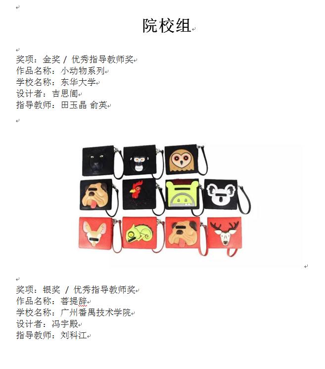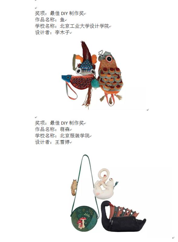 本届设计大赛,院校组作品设计与制作更加用心,风格独特、大胆创新,与市场需求接轨方面也更趋成熟。院校组思维天马行空、创意无限,突破当前市场主流设计元素与材料的应用,或大胆张扬、或视觉冲击力强、或概念超前,令人眼前一亮。金奖作品小动物系列,在材料应用、图案设计与做工上都丝毫不逊于专业组,灵巧、致趣而不失精美。