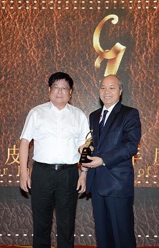 颁奖嘉宾:中国皮革协会副理事长、北海东红制革有限公司董事长施荣川(左)