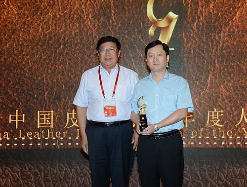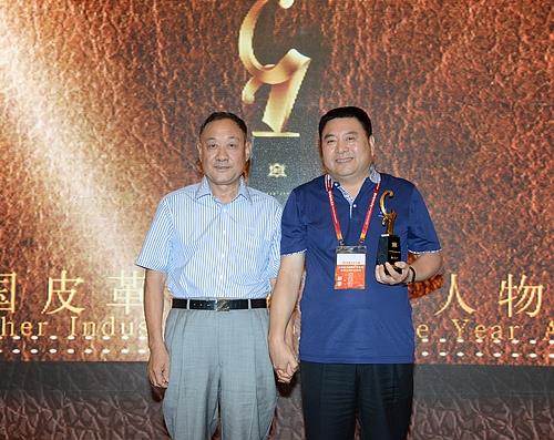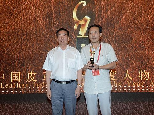 颁奖嘉宾:中国皮革协会副理事长、辛集皮革城有限公司董事长梁国申(左)