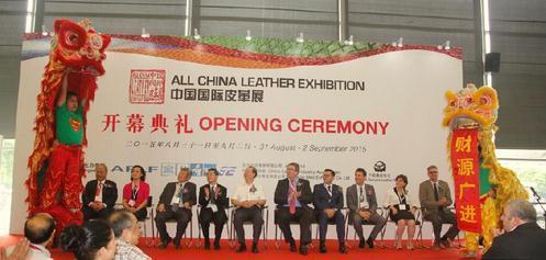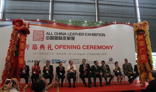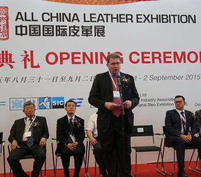 中国皮革网讯 (记者杨君华上海报道)8月31日,2015第十八届中国国际皮革展(ACLE)在上海新国际博览中心隆重开幕。中国轻工业联合会副会长兼秘书长王世成、中国皮革协会理事长苏超英、世界台商皮革业协会创会会长杨正、土耳其爱琴海出口商协会副主席Suleyman Tahiroglu、中国家具协会副理事长兼秘书长张冰冰、巴西皮革鞋履与制品部件公司协会首席执行官IIse Guimaraes、国际制革协会执行主席及世界台商皮革协会理事长白志祥、无极县人民政府常务副县长刘金文、巴西制革工业中心执行主席Fernando Bello、亚太区皮革展有限公司董事Frank Boehly等领导与嘉宾出席了本次开幕式。开幕式由中国皮革协会常务副理事长兼秘书长李玉中主持,中国皮革协会理事长苏超英与亚太区皮革展有限公司高级董事麦高德分别致开幕辞。