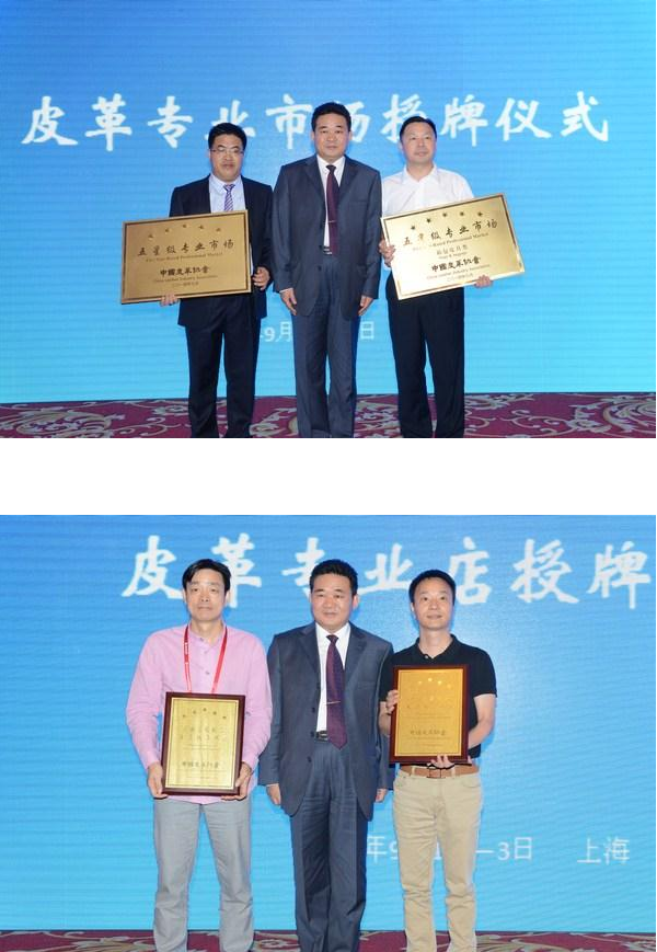 9月2日上午,在上海虹桥宾馆举办的中国皮革协会七届四次理事扩大会议上,举办了隆重的授牌仪式。与会领导为获得荣誉称号的2个专业市场和2个专卖店分别颁发奖牌。