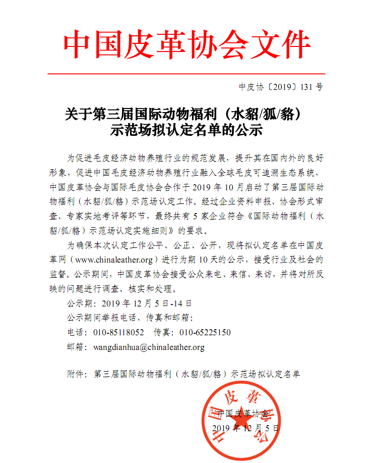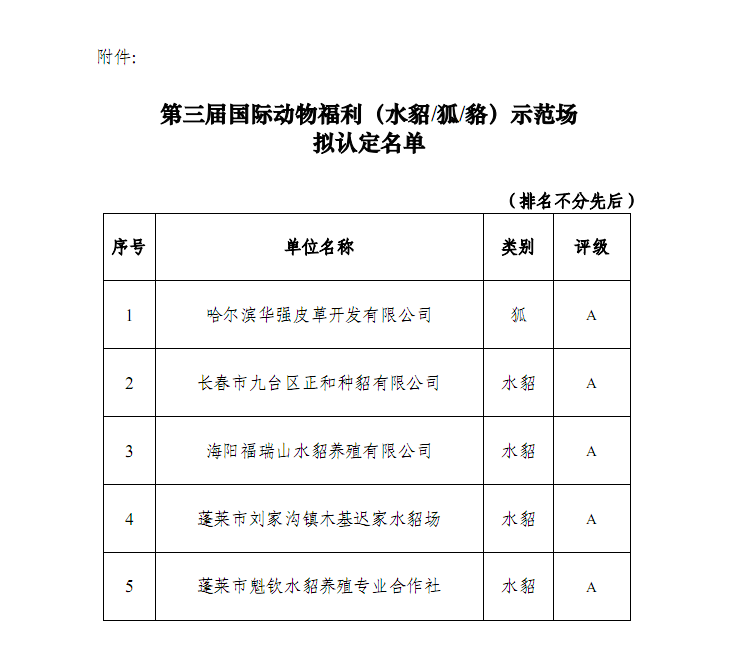 关于第三届国际动物福利(水貂/狐/貉)示范场拟认定名单的公示