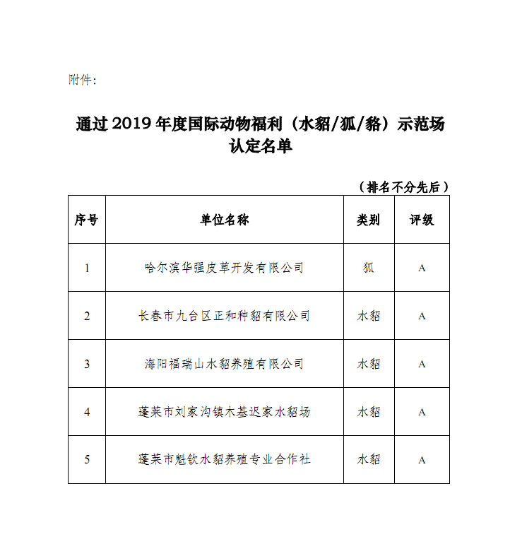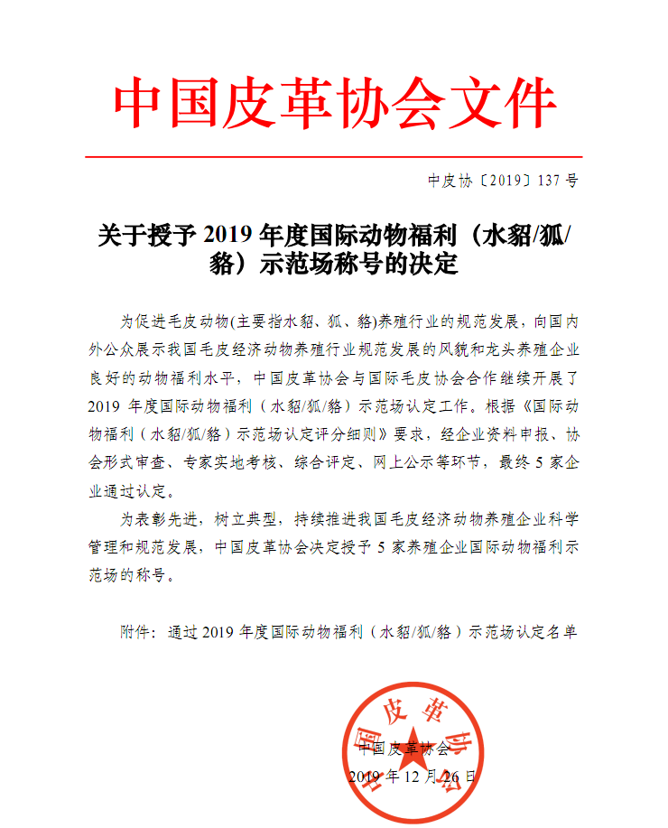 关于授予2019年度国际动物福利(水貂/狐/貉)示范场称号的决定