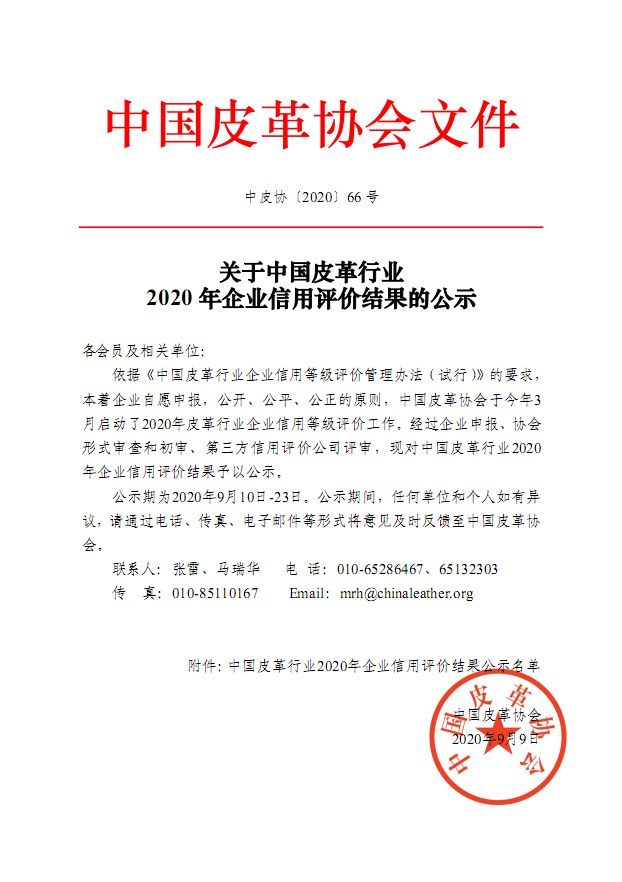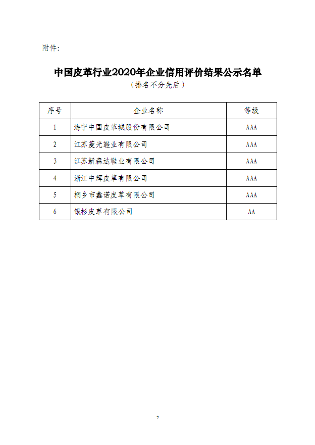 关于中国皮革行业2020年企业信用等级评价结果公示的通知