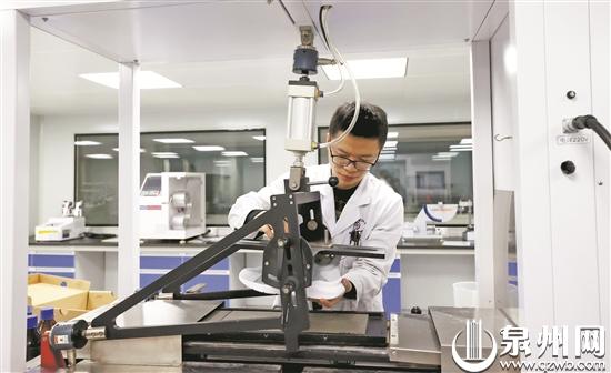 在中鞋革晋江院实验室,科研人员借助高端仪器测试鞋底的止滑性能。