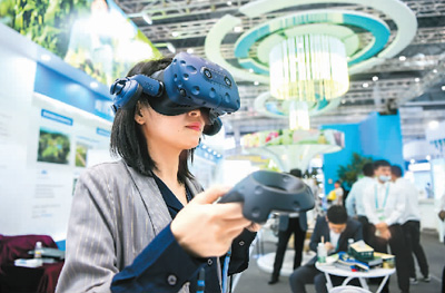 各类展会是促进内外贸一体化的重要舞台。图为2021年12月17日,中国(海南)国际热带农产品冬季交易会在海口市海南国际会展中心举行,一名工作人员使用VR设备展示数字农业的独特体验。苏弼坤摄(人民视觉)