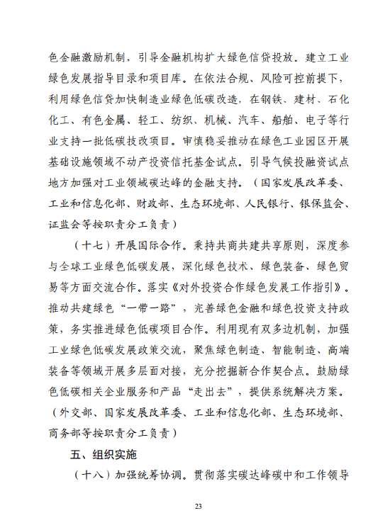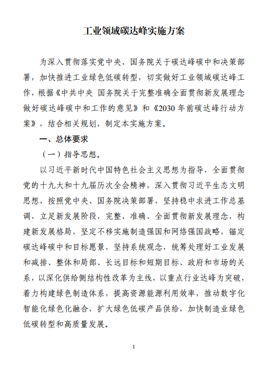 《工业领域碳达峰实施方案》已经碳达峰碳中和工作领导小组审议通过,现印发给你们,请认真贯彻落实。