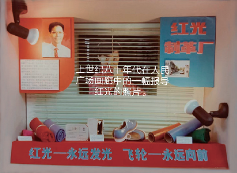 20 世纪80 年代在上海人民广场画廊中一幅有关上海红光制革厂的报道 (右上红光厂大门、左上时任厂长朱建海、下方系产品展示)