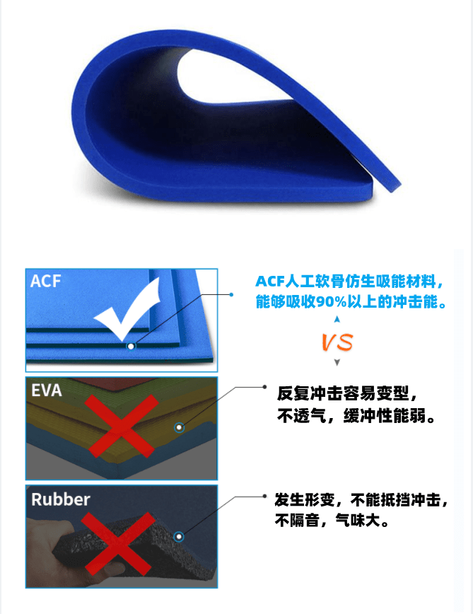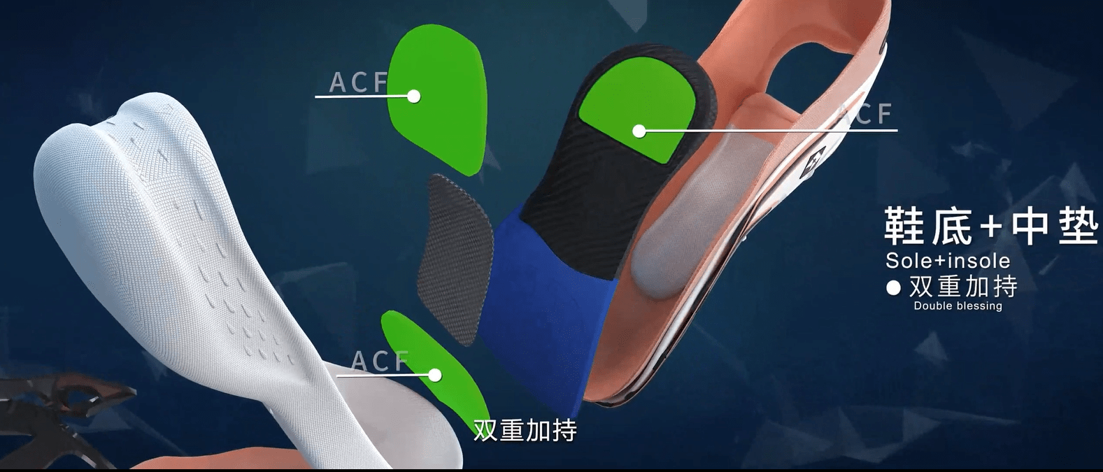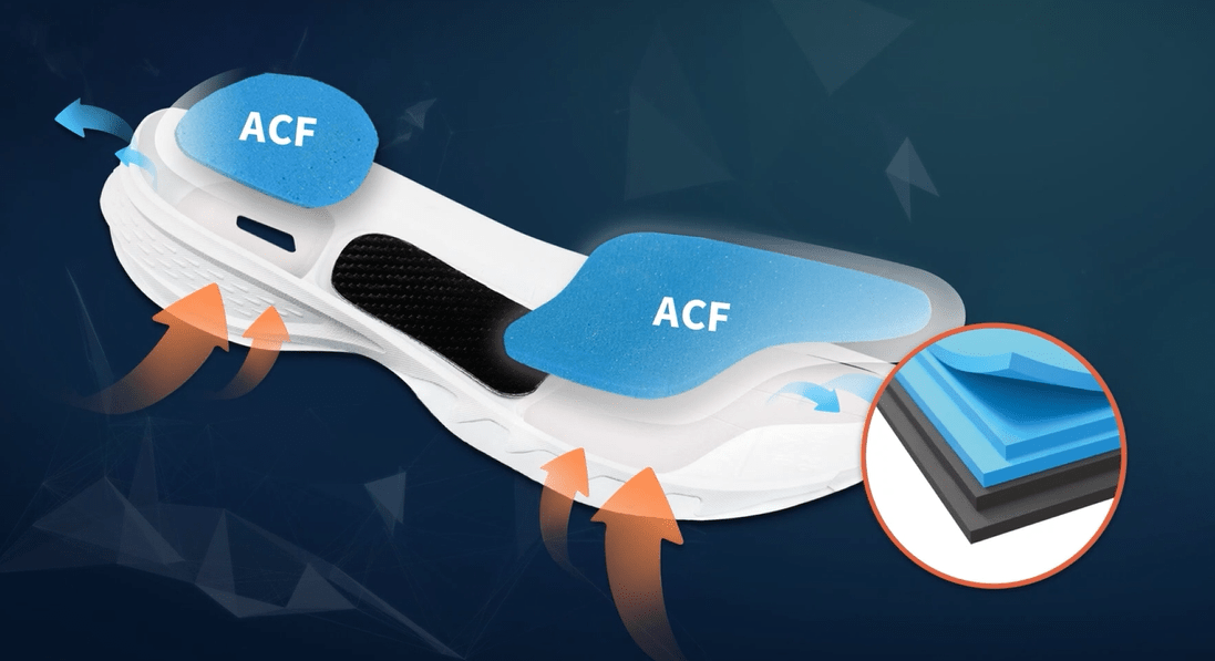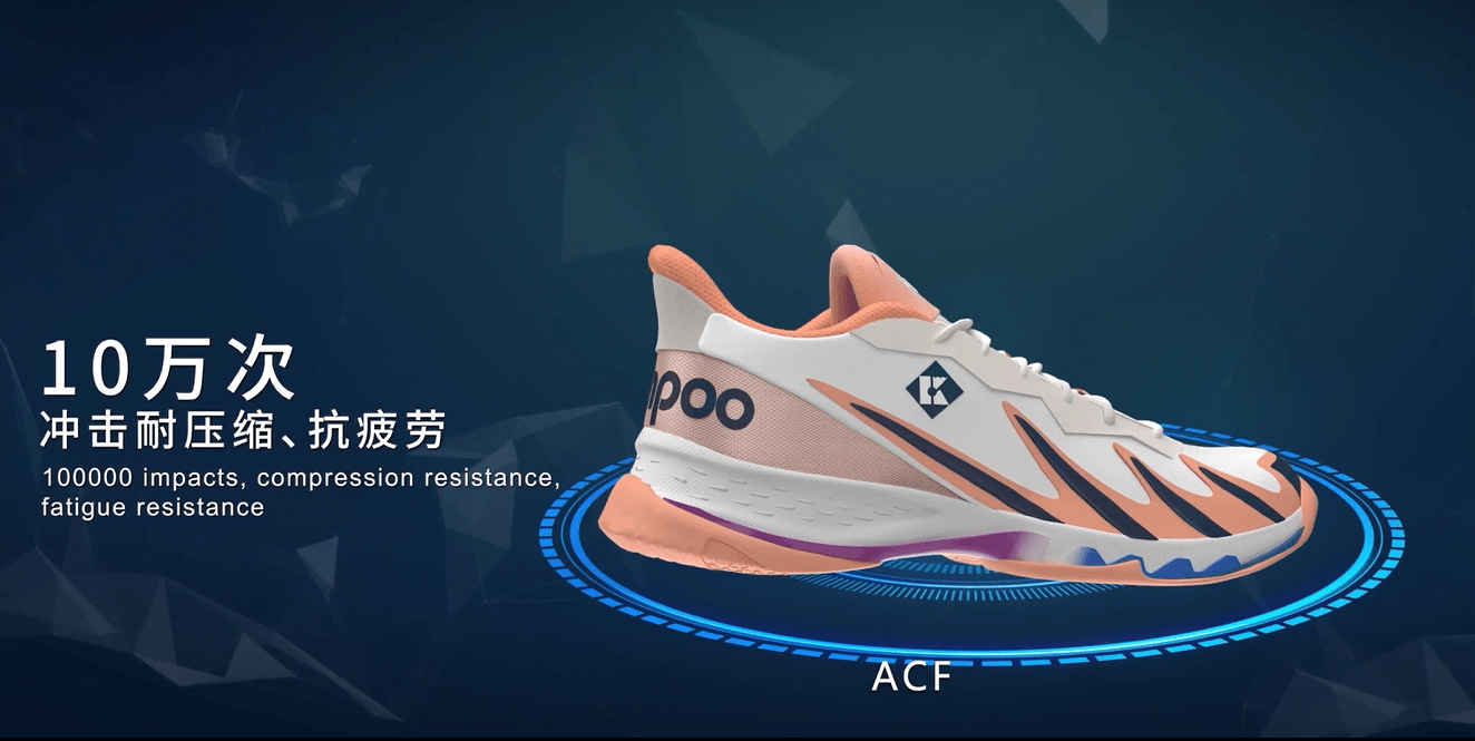 现代运动球鞋普遍采用抗冲击材料来提高鞋子的缓冲性能。这种材料可以在运动员受到冲击时,有效地吸收能量,减少脚部和膝盖受到的伤害,特别是在一些运动量大,或高低落差比较大的运动项目,如中长跑步、马拉松、越野跑、篮球、足球、羽毛球、滑雪等极限运动,登山攀岩等户外运动,鞋子的减震效果尤为重要,可以为运动员起到很好的安全保护作用。例如,ACF人工软骨材料就是一种高性能的抗冲击高科技材料,可以瞬间吸收高达90%的冲击力,可做为运动鞋的鞋中底和中垫,主要是提高鞋子的抗冲击性能,为运动员提供卓越的缓冲性能,保护脚底和膝关节不受损伤,增持耐久。