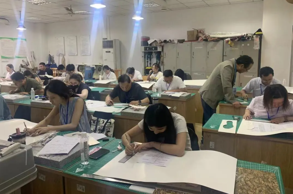 本期研修班为期6天,教学内容精彩纷呈,中国轻工大国工匠陈国学讲授鞋楦设计核心技术,国家一级鞋类设计师盛锐和杨玉良讲授皮鞋(胶粘、固特异)传统手工制作工艺,国家一级皮具设计师赵丹和杨锁美讲授箱包、皮具皮雕工艺技术与实操。研修班还邀请普拉达时装商业(上海)有限公司售后经理李翠云和技师周启讲授品牌产品的售后管理与维护工艺技术,独立策展人邓君讲授陈列设计与陈列管理,品牌经理人杨卓琳老师讲授制鞋、箱包、服装行业品牌设计案例剖析与市场研究,广州履朴信息科技有限公司曹中华讲授人工智能平台与软件辅助产品设计研发及实操。