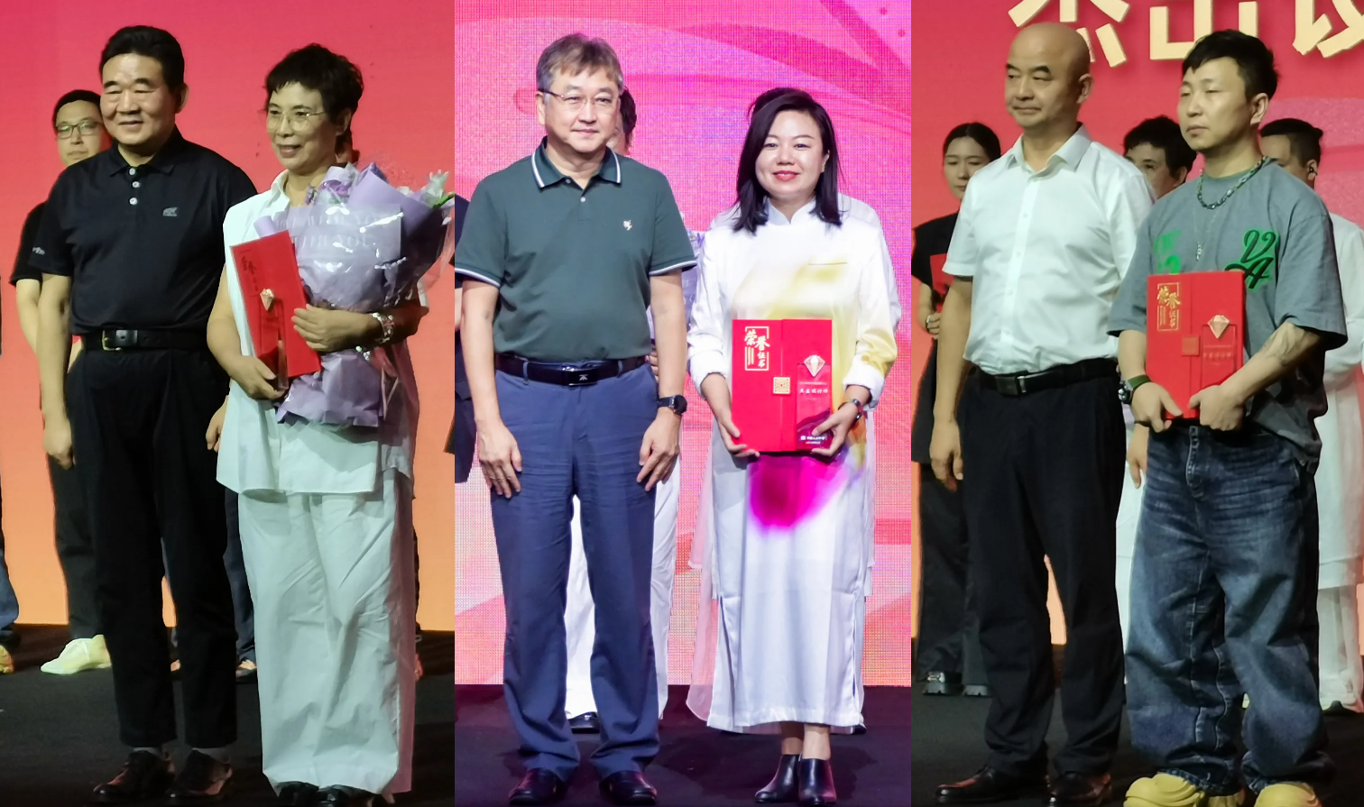 李玉中、王双清、章如强为三位杰出设计师颁发奖杯和证书