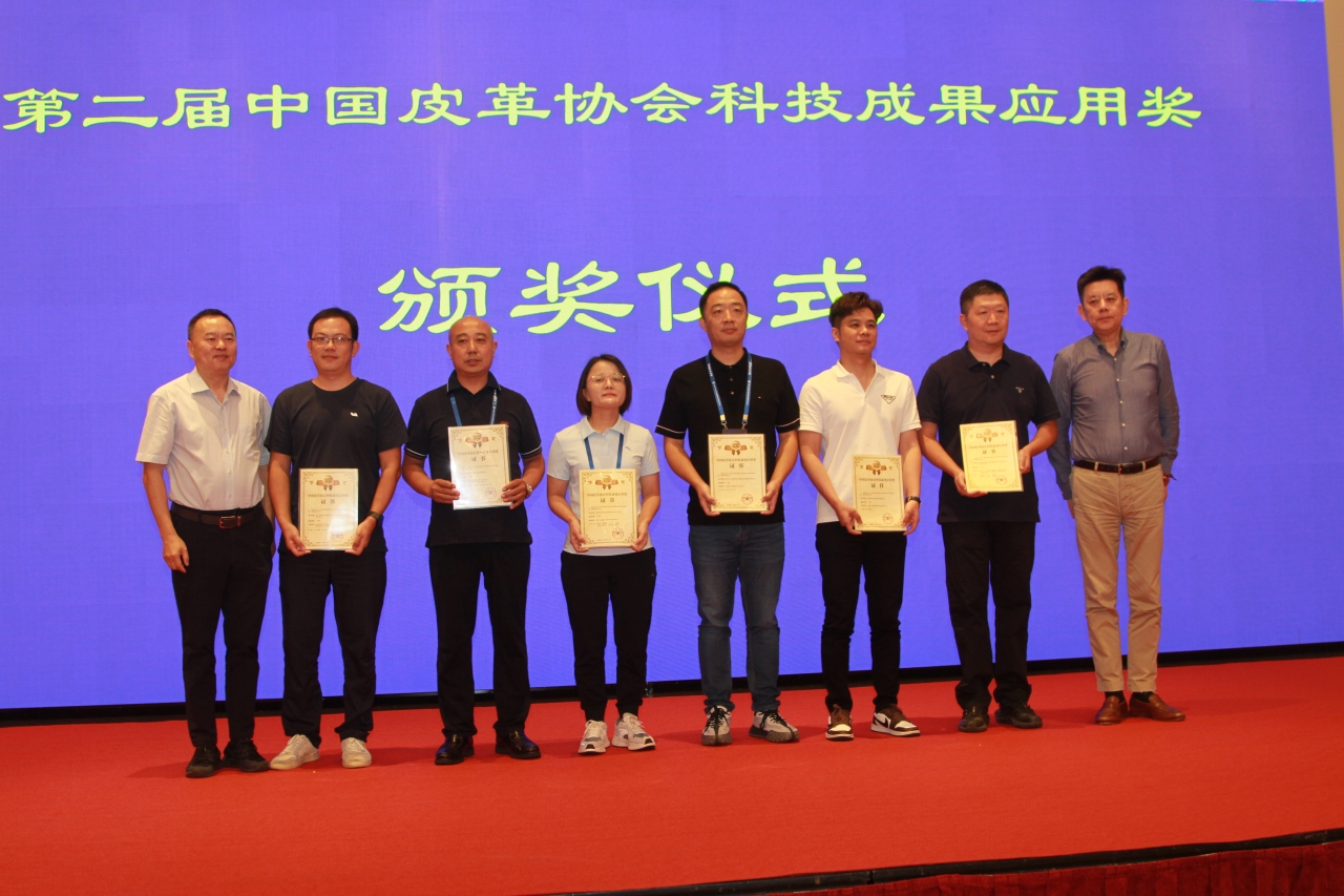 中国皮革协会副理事长、上海皮革有限公司总经理王强,中国皮革协会副理事长、明新旭腾新材料股份有限公司董事长庄君新为获三等奖项目代表颁奖