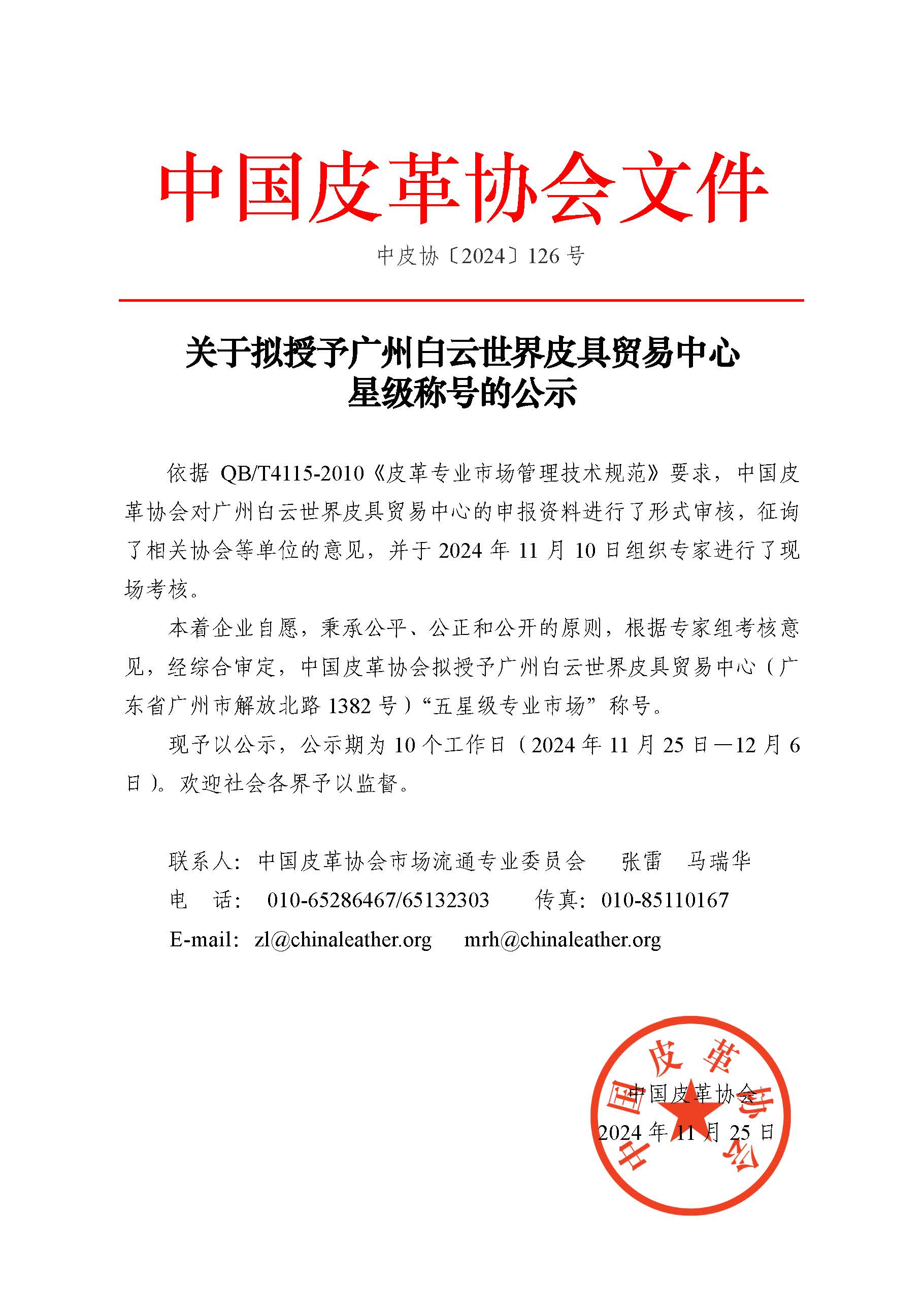 2024关于拟授予广州白云世界皮具贸易中心 星级称号的公示
