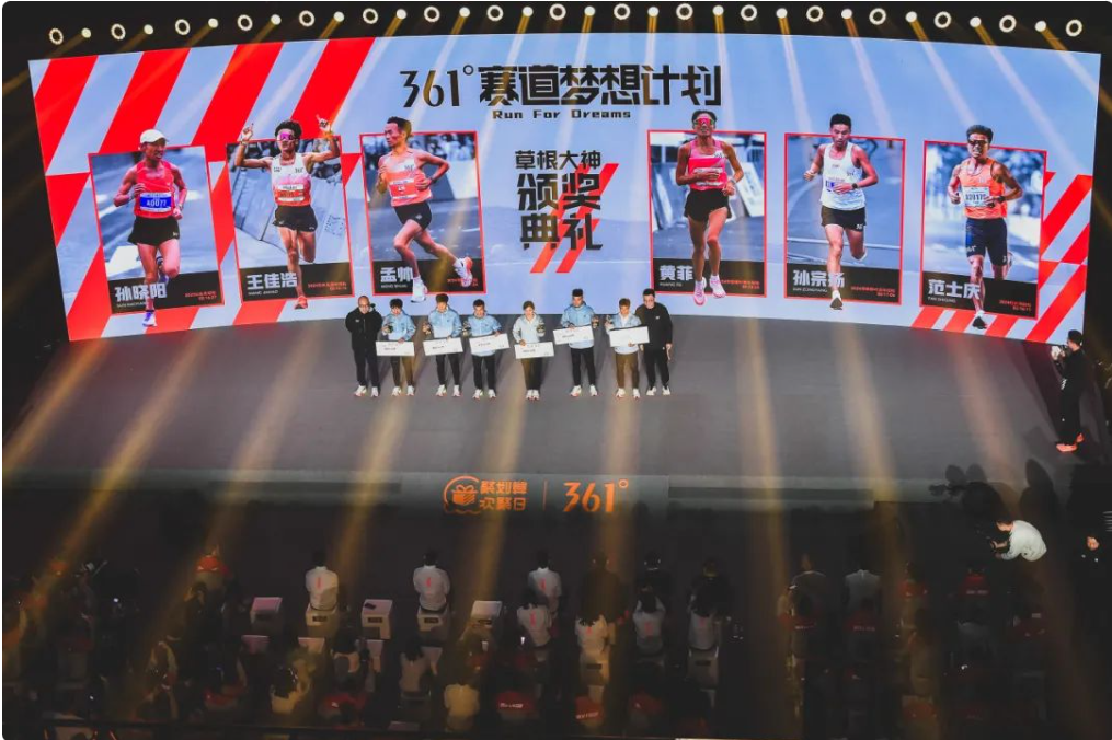 首先,发布会上年度草根大神颁奖典礼成为一大亮点。361°品牌管理中心总经理郑业欣和361°电子商务管理中心兼鞋产品中心总经理王新宁,为王佳浩、孙晓阳、黄菲、孟帅、孙宗阳、范世庆在内的6位年度草根大神颁发奖杯及奖金支票,用实际行动支持每一位跑者追逐赛道梦想。