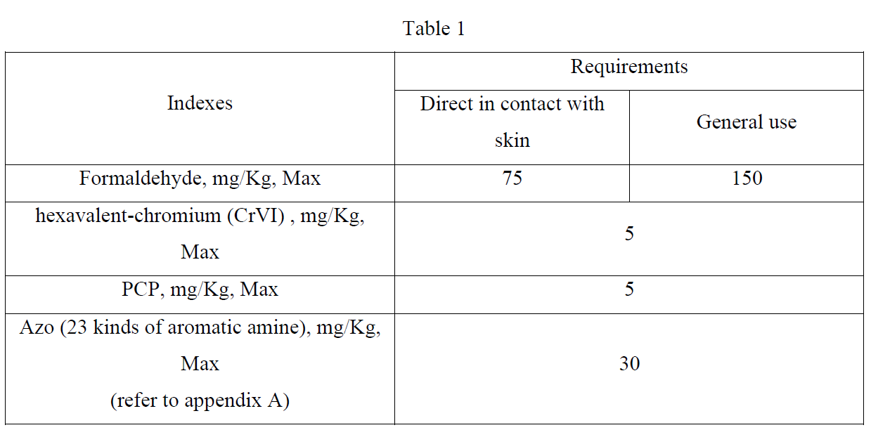 1. It sets the specifications for four restricted substances possibly present in leathers, such as Hexavalent-chromium, Azo Colourants, Pentachlorophenol (PCP) and Formaldehyde, on top of the general specifications for physical testing and chemical analysis. The objective of this is to bring in line the Chinese leather industry with the current international practice.
