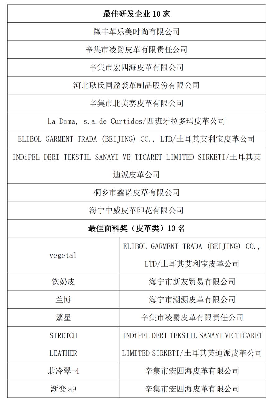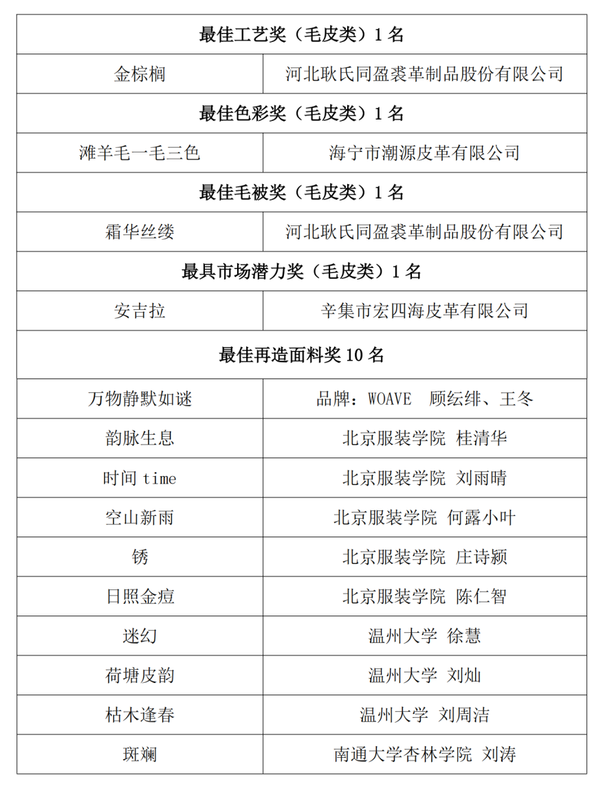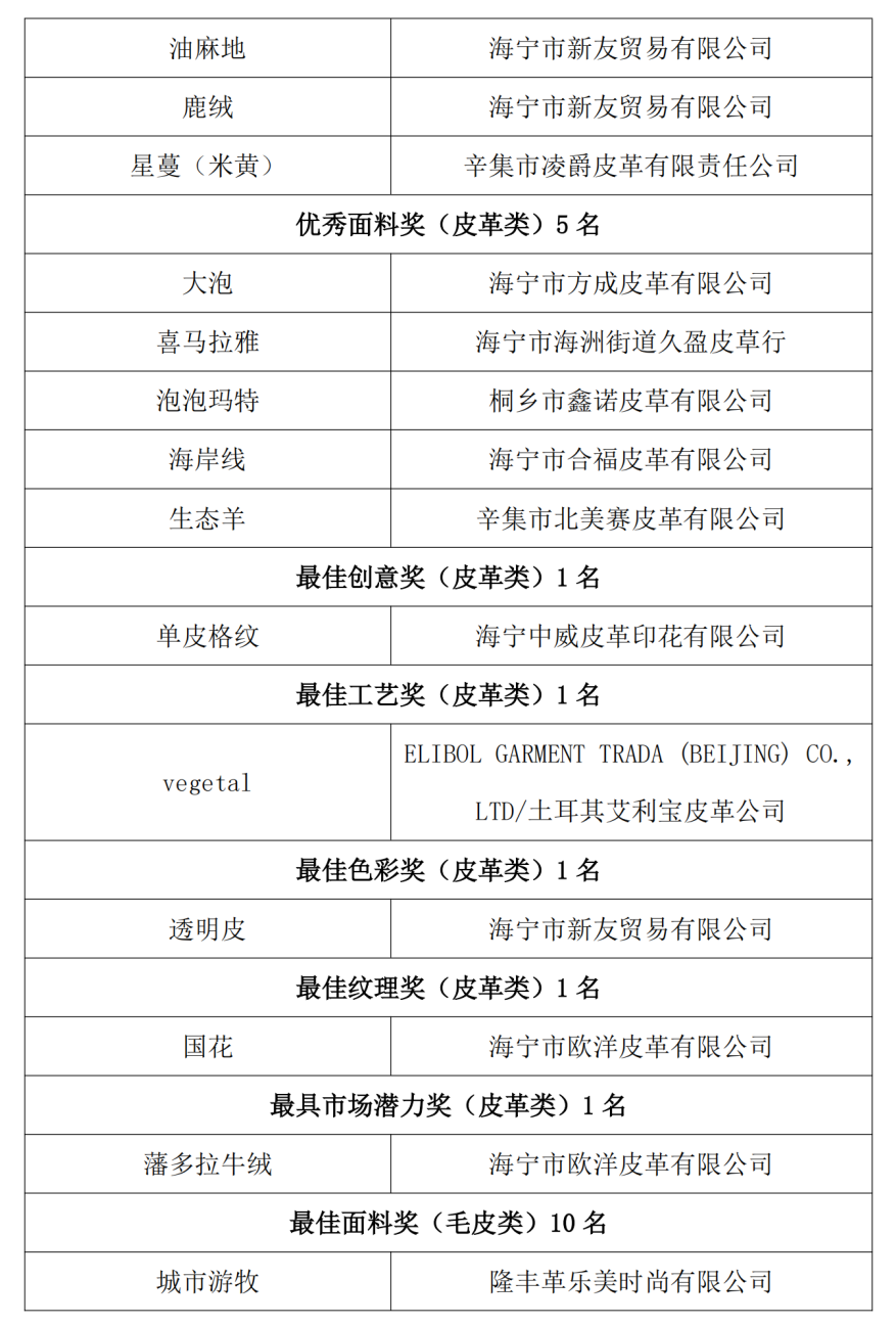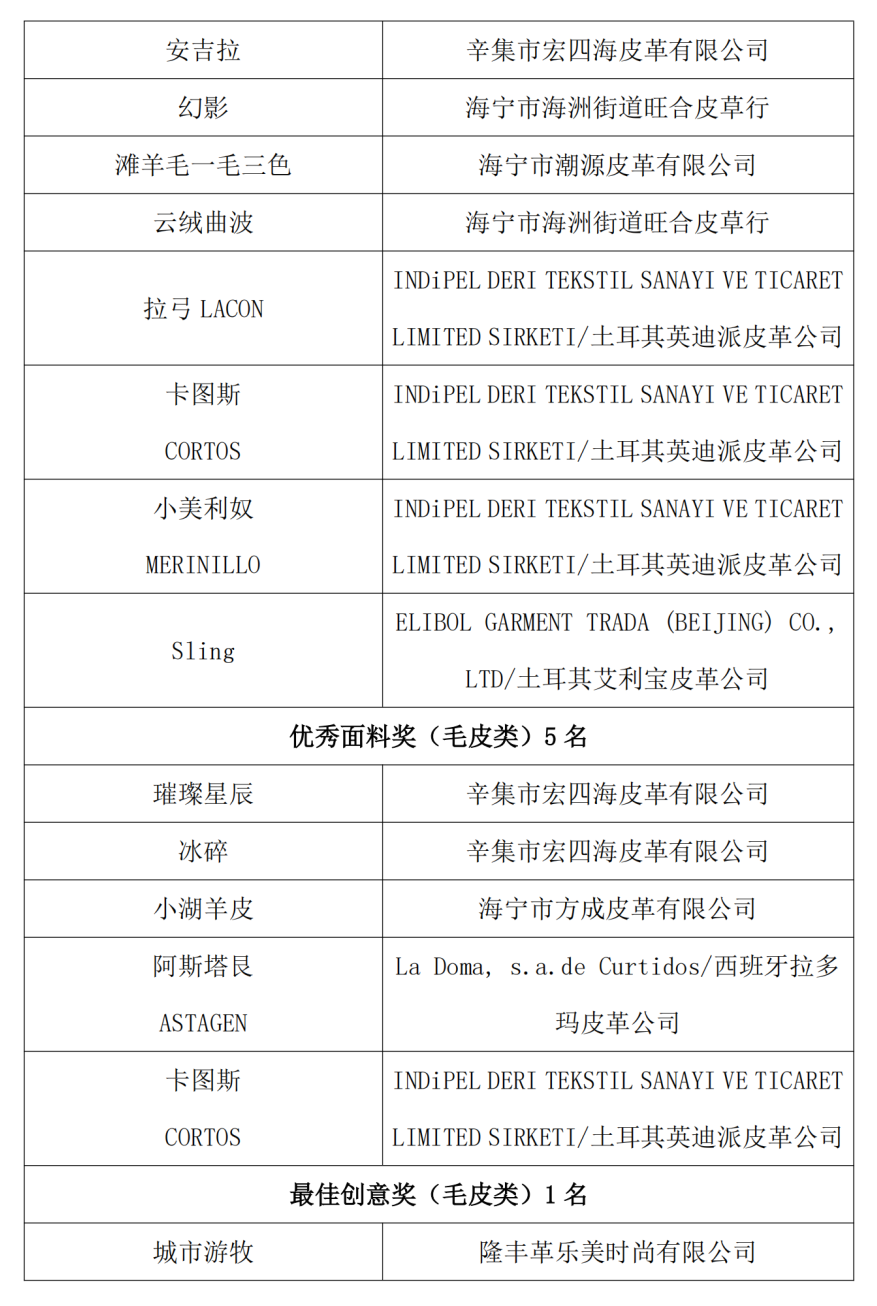 经评审委员会评定,共评选出了最佳研发企业奖10名,最佳面料奖20名(皮革类、毛皮类各10名),优秀面料奖10名(皮革类、毛皮类各5名),单项奖:皮革类5名(最佳创意奖、最佳工艺奖、最佳色彩奖、最佳纹理奖、最具市场潜力奖各1名)、毛皮类5名(最佳创意奖、最佳工艺奖、最佳色彩奖、最佳毛被奖、最具市场潜力奖各1名),最佳再造面料奖10名,现将结果予以公布。