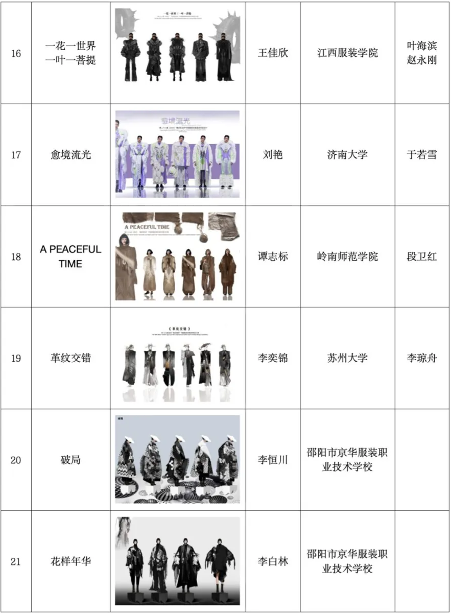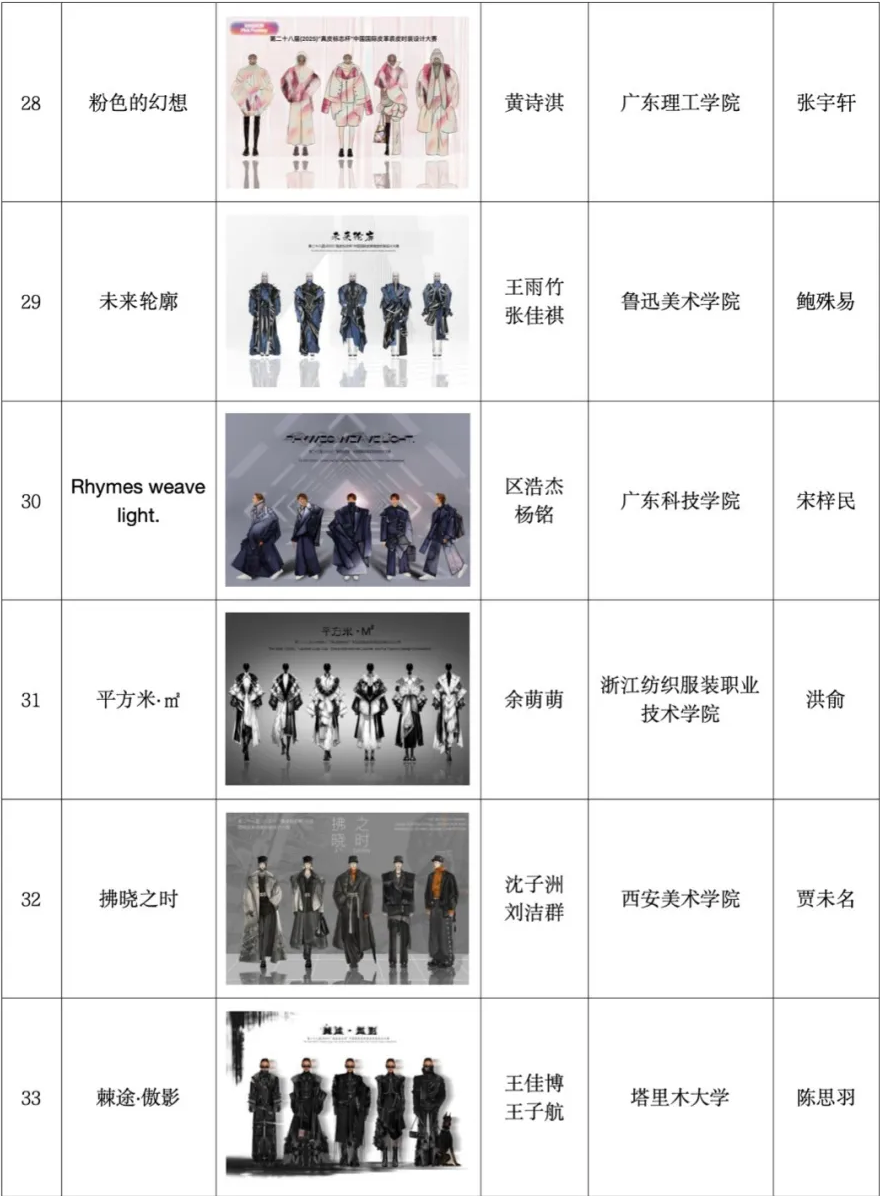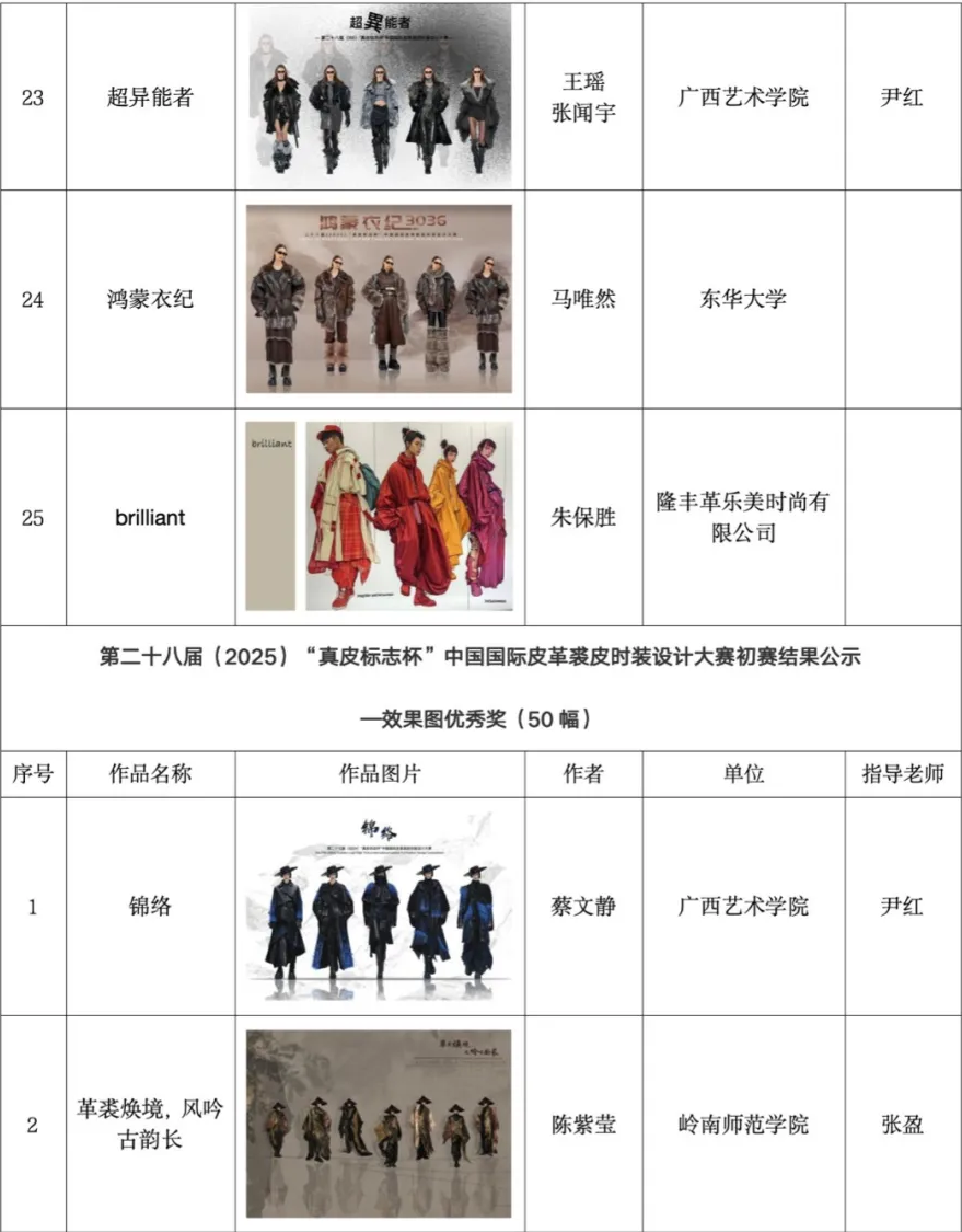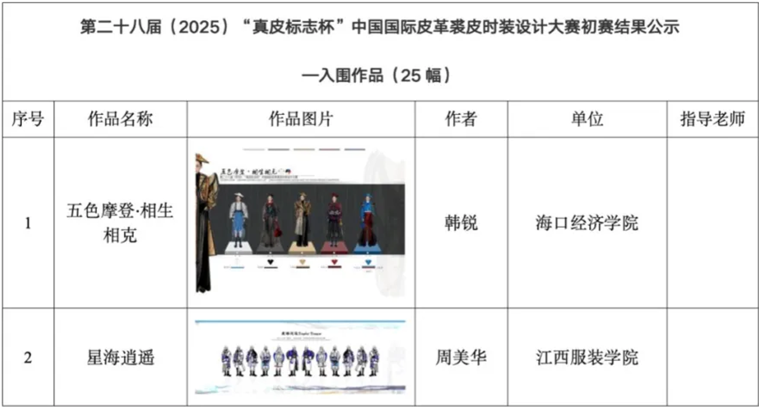 第二十八届(2025)“真皮标志杯”中国国际皮革裘皮时装设计大赛初赛评选工作已于2025年3月20日结束。大赛自2024年11月启动报名工作以来,共收到来自江西服装学院、长春人文学院、东北电力大学、盐城工学院、闽南科技学院、辽宁传媒学院、郑州经贸学院等110所院校的1186幅参赛作品。经评审委员会评定,共评选出入围作品25幅,效果图优秀奖50幅。现将结果予以公示。
