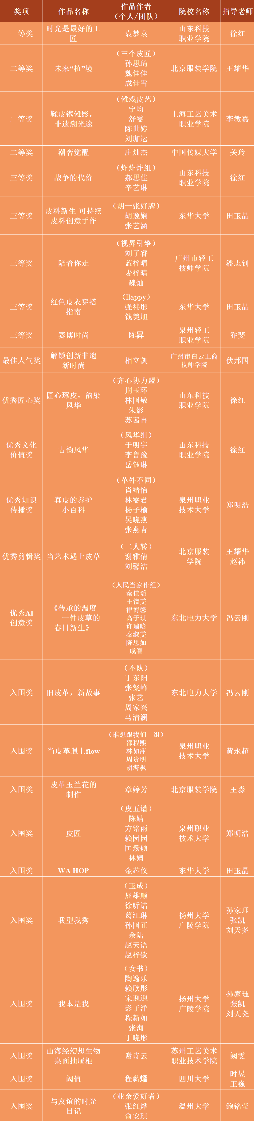 2025年7月3-5日期间,大赛组委会在中国皮革网、中国皮革协会微信公众号对评选结果进行了公示,接受社会各界监督。最终,获奖名单在7月8日正式发布,大赛评选出社会组、学生组一等奖各1名、二等奖各3名、三等奖各5名、单项奖各6名、入围奖各10名。在此次大赛组织中表现突出的单位和院校获评“最佳组织奖”。组委会计划近期举办大赛交流会,获奖选手代表、评委和指导老师将以线上和线下相结合的方式参与交流会,畅谈体会和感想。颁奖典礼将于9月初在上海举办,部分评委和获奖代表将受邀参加颁奖典礼。