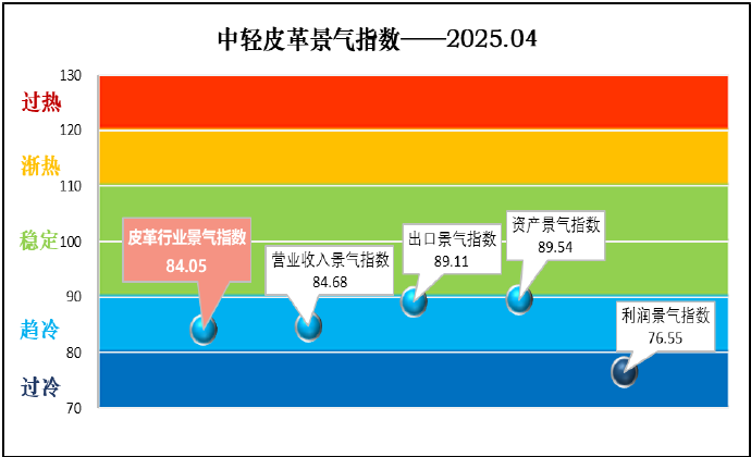 中国皮革协会和中国轻工业信息中心联合发布2025年4月中轻皮革景气指数,4月份中轻皮革景气指数为84.05,继续处于趋冷区间。其中:主营业务收入景气指数84.68、出口景气指数89.11、资产景气指数89.54、利润景气指数76.55。