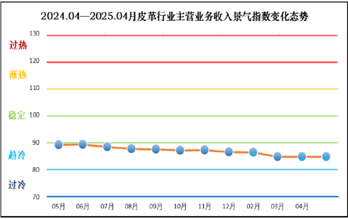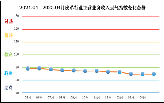 2025年4月皮革主营业务收入景气指数为84.68,低于上月0.06点,继续处于趋冷区间。