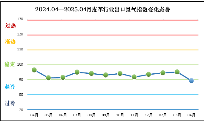 2025年4月皮革出口景气指数为89.11,低于上月5.80点,跌出稳定区间至趋冷区间。