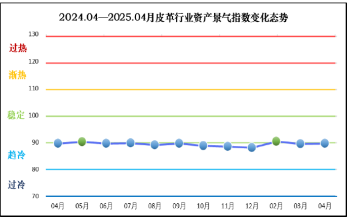 2025年4月皮革资产景气指数为89.54,高于上月0.05点,处于趋冷区间。