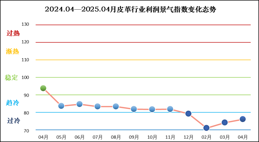 2025年4月皮革利润景气指数为76.55,高于上月1.90点,继续处于过冷区间。