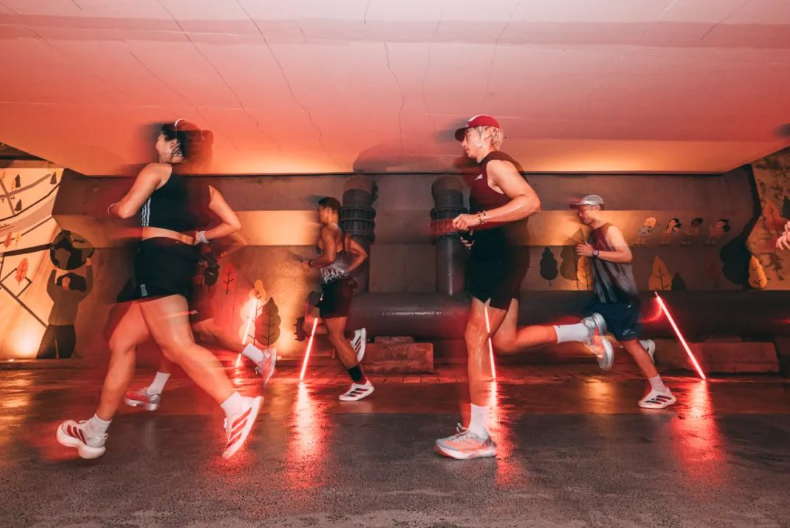 ADIZERO EVO SL竞速美学空间选址苏州河畔艺术画廊,以水流意象为灵感,将EVO SL全新银红配色与流动光影设计相结合;沿街设计互动装置,将水流与心流动态融合,实时捕捉跑者身影,并于苏州河畔打造创意光影秀。