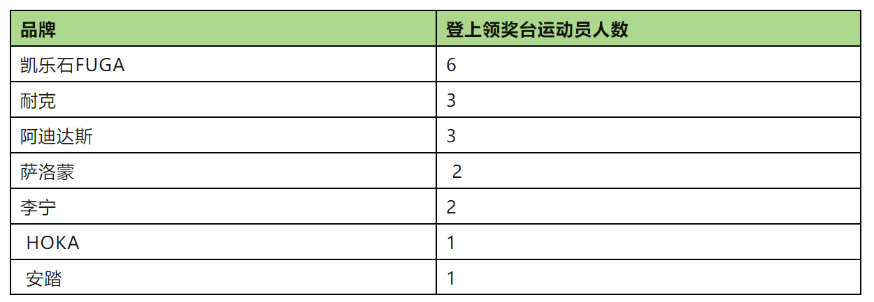 在竞争最激烈的168KM、100KM和70KM组别领奖台上,凯乐石FUGA以6名运动员的穿着选择独占鳌头,力压耐克和阿迪达斯(各3人)等国际巨头。
