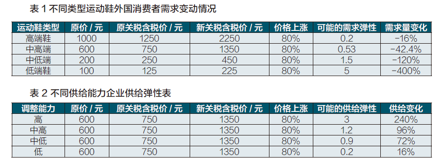 根据上面弹性公式,设定一双低端运动鞋价格为100元;中低端的运动鞋价格为200元;中高端运动鞋价格为600元;高端运动鞋价格为1000元,原关税为25%,新关税为125%。测算结果如下: