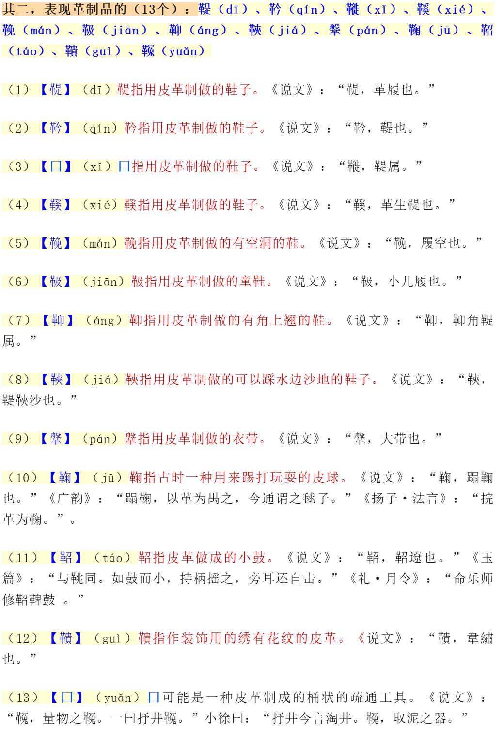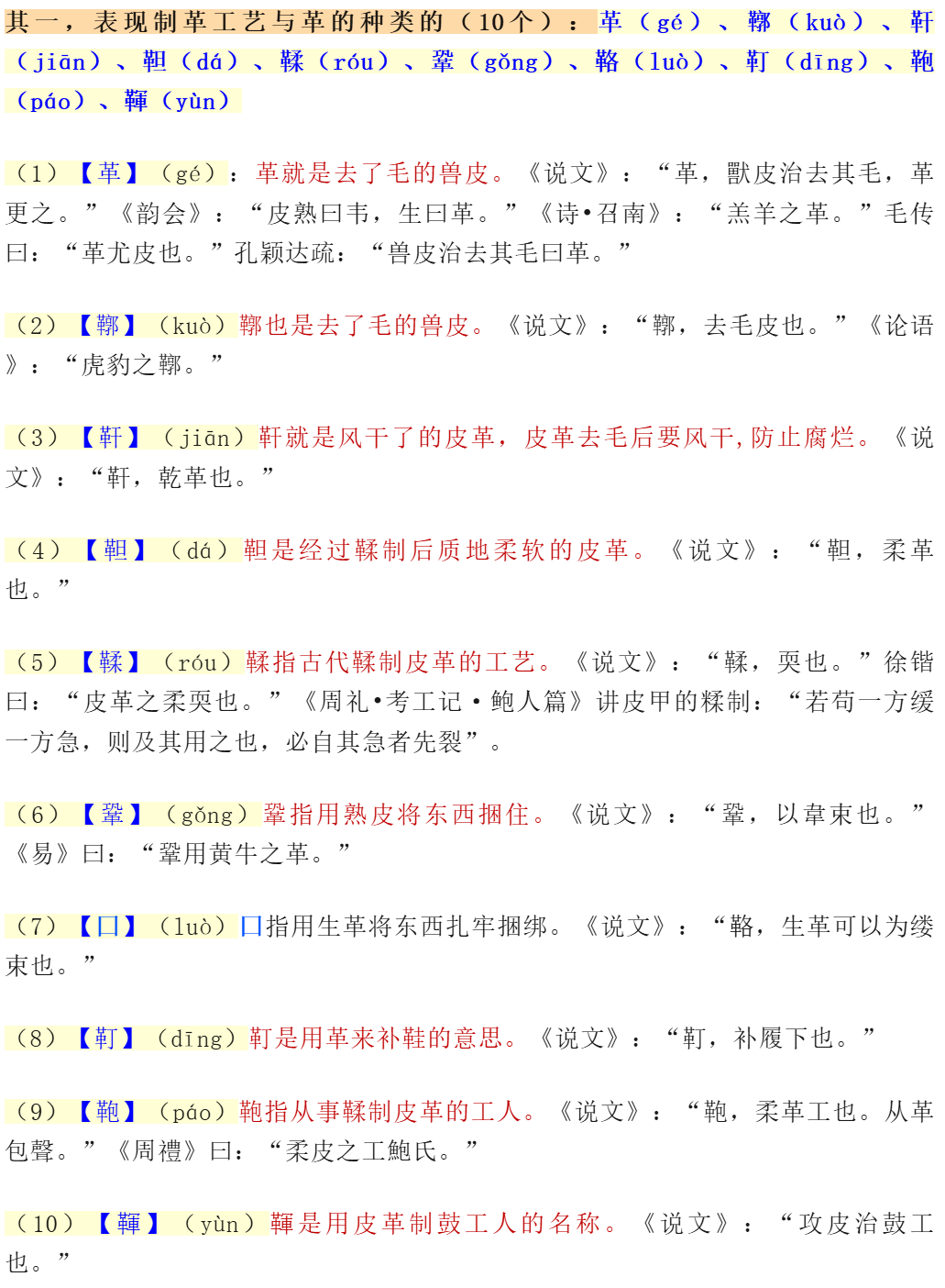 表现制革工艺的革部字反映的是人类利用与加工自然材料的技术进步,《说文》革部有关制革工艺与革制品的字共有23个,又可大别为如下两种情形: