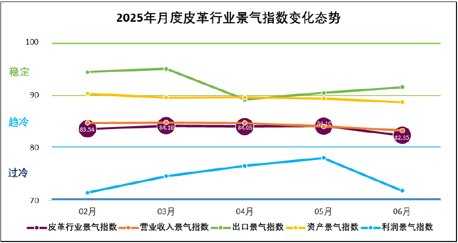 中轻皮革景气指数2025年上半年全处于趋冷区间,反映了行业发展困难较大。从上半年的细分景气指数来看,主营业务收入景气指数、资产景气指数基本处于趋冷区间;出口景气指数基本处于稳定区间;利润景气指数处于过冷区间,行业企业利润空间进一步收窄。