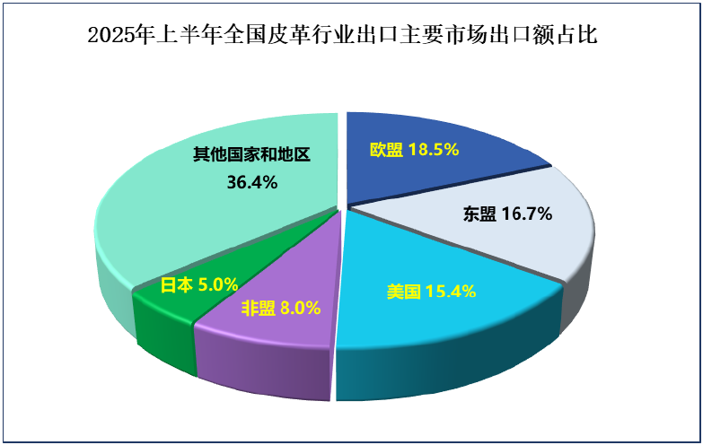 我国对“一带一路”和RCEP区域国家出口小幅回落。2025年上半年,中国皮革行业对“一带一路”沿线国家的出口总额达161.5亿美元,同比下降8.8%,占皮革业出口总额的37.4%,占比较上年下降0.4个百分点。2025年上半年,中国皮革行业对RCEP区域国家出口总额达114.4亿美元,同比下降8.8%,占皮革业出口总额的26.5%,占比较上年下降0.3个百分点。