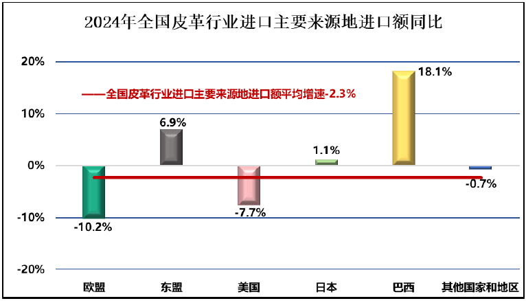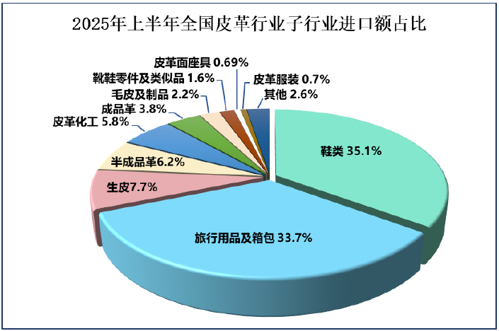 2025年上半年,我国宏观经济运行平稳,居民收入稳定且小幅提升,就业形势总体稳定,为消费增长创造了一定条件,但皮革行业产品市场需求内生动力不足,消费意愿有待进一步提升。2025年上半年,我国社会消费品零售总额同比增长5.0%,而服装、鞋帽、针纺织品类商品零售额同比增长3.1%,其中实物商品网上零售额中,穿类商品增长1.4%,均明显低于社会消费品零售总额平均增速。 今年上半年,我国皮革行业进口总额75.3亿美元,同比下降13.6%。 我国皮革行业的进口以制成品为主,今年上半年制成品进口占比为72.7%。其中,进口鞋类0.9亿双,进口额26.4亿美元,同比分别下降11.6%、9.7%;进口旅行用品及箱包进口额25.4亿美元,同比下降14.8%。