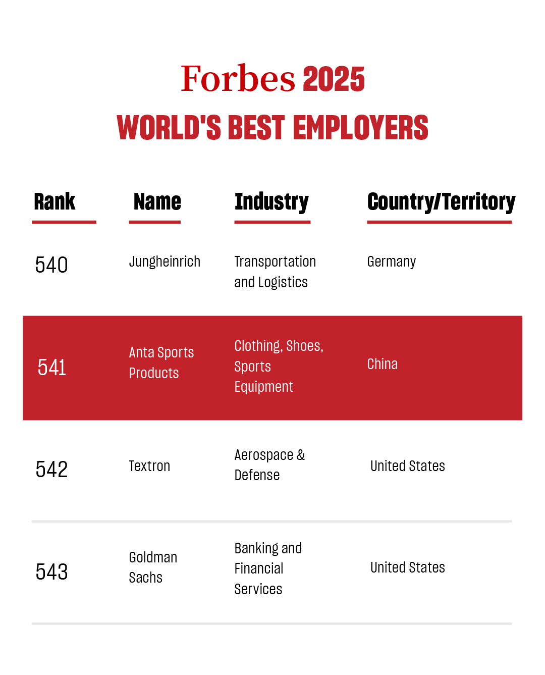 日前,福布斯发布2025年度“全球最佳雇主”榜单,安踏集团凭借在人才发展、企业文化及员工关怀等方面的卓越表现,与微软、腾讯等全球顶尖公司一起上榜,这也是安踏集团第五次获得“福布斯全球最佳雇主”殊荣。