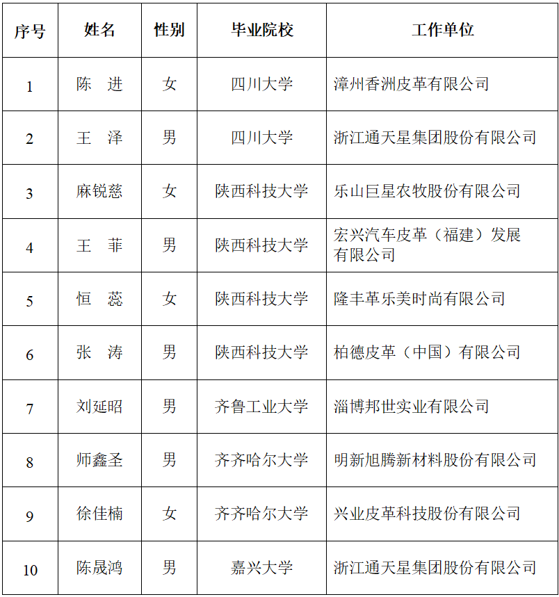 经各院校老师和企业推荐、协会秘书处初审、中国皮革工匠助长专项基金专家委员会投票评审、协会理事长办公会批准、网上公示等综合评定程序,中国皮革协会现发布公告,陈进等10人为2025年中国皮革工匠助长专项基金获奖者。