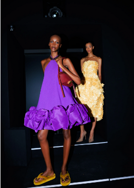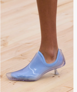 本季设计弱化了以往的夸张形体冲击,转而聚焦于材质的微妙蜕变——通过浸泡抛光技术处理的皮革呈现出湿润般的柔软光泽,配合不规则手工捏褶的鞋面与如水滴凝固而成的琥珀色鞋跟,在极简的穆勒鞋与乐福鞋廓形中构筑出有机的生命感。
