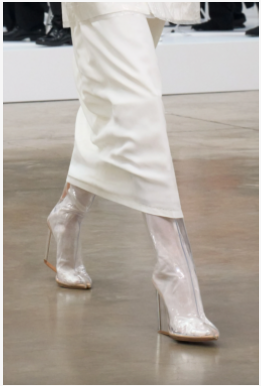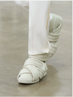 作为Glenn Martens入主Maison Margiela后的首个成衣系列,他在新系列中致敬诸多Martin Margiela上世纪九十年代的代表性设计,而在鞋履方面,则致力强化延展品牌档案中的经典轮廓,Tabi鞋款的分趾采用了更犀利的尖趾设计,而经典Future迎来再度复兴,并在其外周叠加上类似凉鞋的缠绕设计,延续品牌先驱反叛的设计内核。