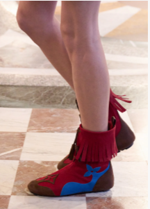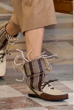 Louis Vuitton 2026春夏系列鞋履在女装艺术总监Nicolas Ghesquière的执掌下,以「时空游牧」 为核心命题,展开一场关于廓形与材质的激进对话。本季最具突破性的设计体现于建筑感异形跟靴履——通过将未来主义金属支架与文艺复兴时期拱廊线条熔铸于鞋跟结构,搭配3D打印技术制成的渐变琉璃质感材质,在足下构筑出穿越时空的微型纪念碑。