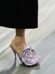 在Jonathan Anderson执掌Dior后的首个女装系列中,鞋履设计成为诠释其"复古未来主义"理念的重要载体:饰有立体玫瑰的缎面高跟鞋将品牌经典的花园意象绽放于足尖,其夸张的花瓣比例颠覆了传统优雅的尺度;同时,复刻Roger Vivier时期"兔耳结"装饰的玛丽珍鞋以焕新姿态重现黄金时代的风韵,而解构重制的粗跟乐福鞋则通过不对称金属扣件实现古典与当代的对话。这些鞋履既延续了Dior自1947年以来的法式美学基因,更通过Anderson特有的雕塑感造型与戏剧化比例,在精致工艺与超现实幻想之间建立起全新的平衡法则。